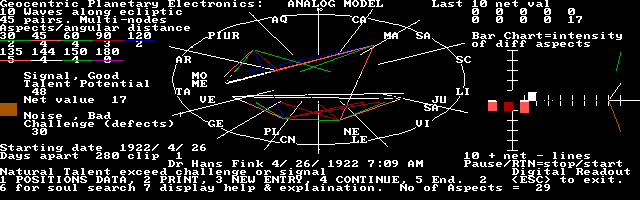 The idea is to find a date (time) when the SHAPE or effect of distortion - compression formed by the Sun and the Planets on the Earth's Tear Shape Object (an area of Electromagnetic activities) is the same or similar to that at the time of birth as given by the Natal Horoscope (Horoscope at birth) of whoever you are trying to reincarnate or resurrect. 1. To give birth at these times you must plan a conception 9 months before the chosen birth or delivery time. 2. This table was obtained by scanning the Heavens (space) for soul shapes that is similar to or resembles Dr Fink's. An individual's Soul Shape is determined by the shape of the Tear Shape Object Resonating Cavity surrounding the Earth. This in turn is determined by the geometric shape induced upon it by the planets of the Solar System together with the Sun. In archaic terms, the soul shape is determined by the shape of the Horoscope at the individual's birth. The best way to do this is to download Miracle.zip and pkunzip.exe, then unzip it into a directory say c:\miracle. Then run miracle.bat, follow instructions on the screen, and select option "B" in the main selection Menu. Since Dr Fink's birth time is not available, accuracies vary according to different times i.e. orientation of the planetary system , soul shape. In many cases the resemblences are not accurate, and represent the best fit we can get scenario for a given soul shape in the vicinity of time 2-3 years. The purpose of these times / figures is to illustrate how to scan for or locate "Soul Shapes" similar to any given one.Dr Fink's Soul Shape or Natal Horoscope. (Exact Birth Time not available.)